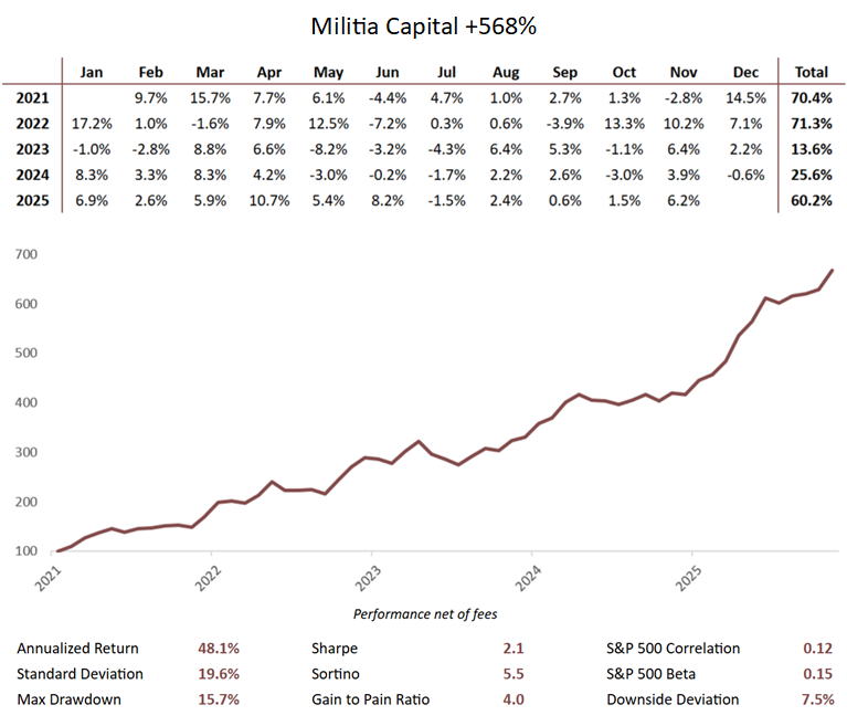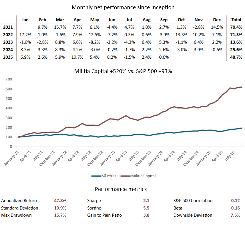 Performance returns – gross and net – are computed by Mr. Orr. Net returns are net of performance fees and management expenses, if any. Upon request, Mr. Orr can provide additional information regarding how gross and net returns are computed. The most recent year figures are unaudited, as are any returns mentioned prior to the fund’s launch in 2021. Past performance is not indicative of future results. Each investor / Limited Partner will receive individual statements from the funds’ administrator showing actual returns. Reference to the S&P 500 does not imply that Militia Capital will achieve returns, volatility, or other results similar to that index. Indeed, while the S&P 500 is a long-only index primary of large capitalization companies, Militia Capital takes long and short positions in many securities. As such, Militia Capital’s portfolio may often differ materially from the S&P 500, hence the manager’s consistent reference in his letters to a lack of correlation. The specific investments identified and described in these letters are not a representation of all potential positions or strategies used by the Fund and, to the contrary, may represent a small percentage of activity. This information is presented to provide insight into explaining the Fund’s performance, Sharpe ratio, or commenting on investment principles such as valuation.