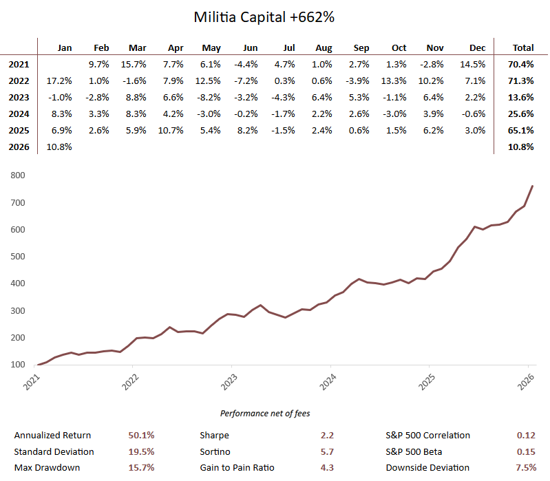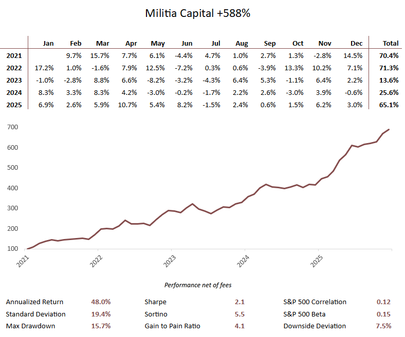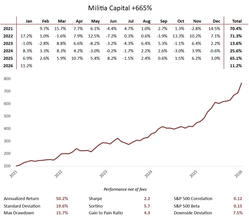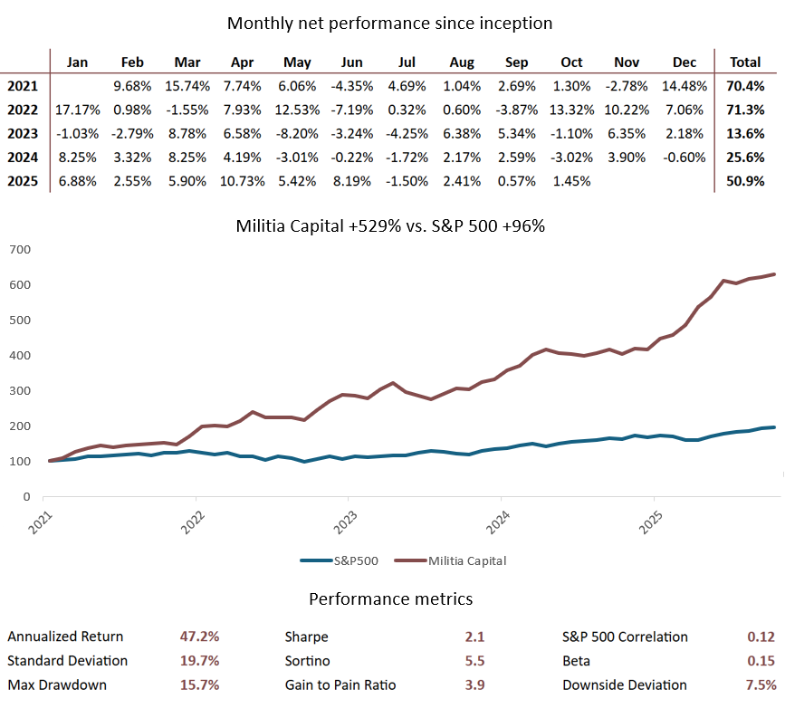 Performance returns – gross and net – are computed by Mr. Orr. Net returns are net of performance fees and management expenses, if any. Upon request, Mr. Orr can provide additional information regarding how gross and net returns are computed. The most recent year figures are unaudited, as are any returns mentioned prior to the fund’s launch in 2021. Past performance is not indicative of future results. Each investor / Limited Partner will receive individual statements from the funds’ administrator showing actual returns. Reference to the S&P 500 does not imply that Militia Capital will achieve returns, volatility, or other results similar to that index. Indeed, while the S&P 500 is a long-only index primary of large capitalization companies, Militia Capital takes long and short positions in many securities. As such, Militia Capital’s portfolio may often differ materially from the S&P 500, hence the manager’s consistent reference in his letters to a lack of correlation. The specific investments identified and described in these letters are not a representation of all potential positions or strategies used by the Fund and, to the contrary, may represent a small percentage of activity. This information is presented to provide insight into explaining the Fund’s performance, Sharpe ratio, or commenting on investment principles such as valuation.